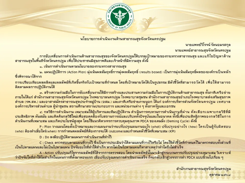 นโยบายสาธารณสุขจังหวัดนครปฐม ปี 2569