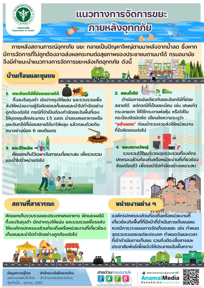 ภายหลังสถานการณ์อุทกภัย ขยะ กลายเป็นปัญหาใหญ่ตามมา ซึ่งทางกรมอนามัยจึงแนะนำแนวทางการจัดการขยะหลังน้ำท่วมอย่างถูกวิธี เพื่อรักษาสุขอนามัยและสิ่งแวดล้อม ดังนี้