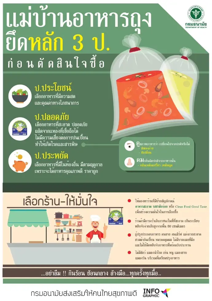 เคล็ดลับในการเลือกซื้อและบริโภคอาหารตามสั่งหรืออาหารบรรจุถุงจากร้านต่าง ๆ อย่างปลอดภัย ควรพิจารณาหลัก 3 ป. ดังนี้: