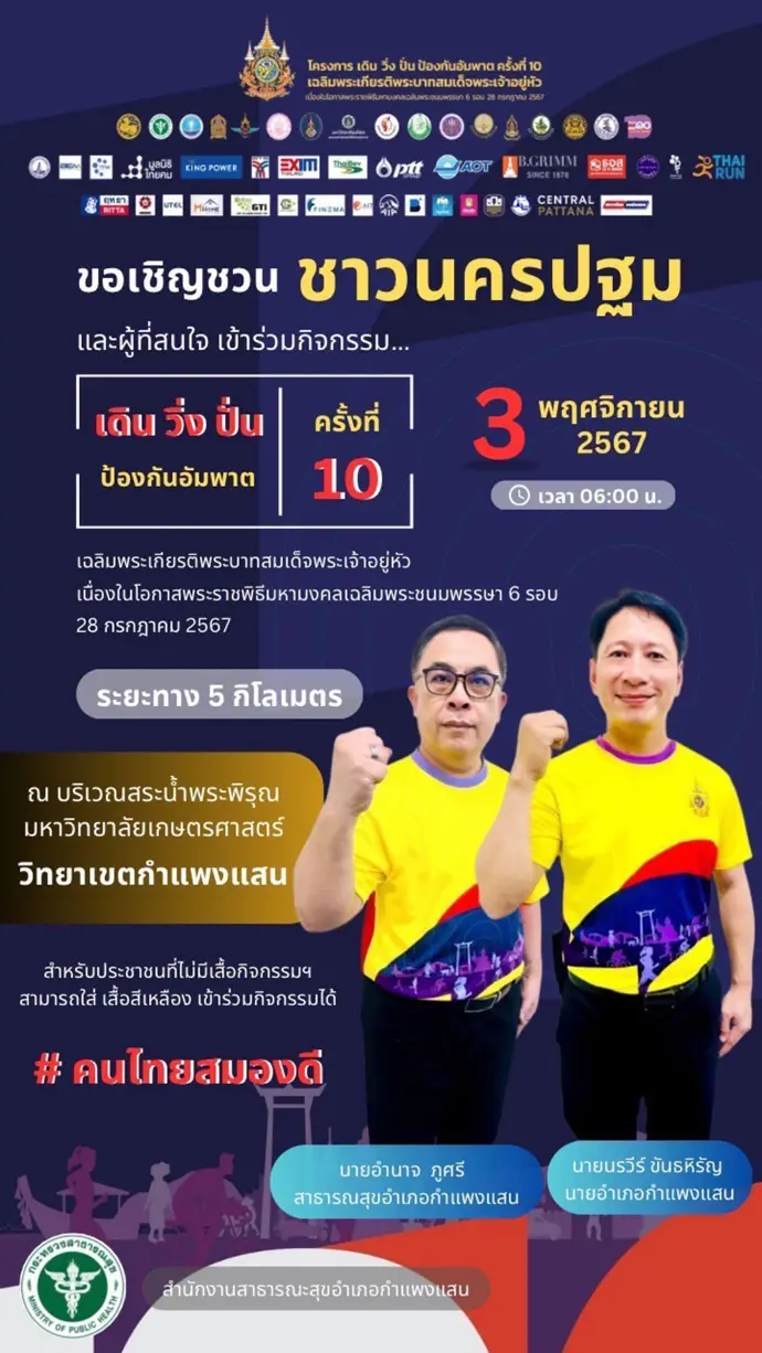 สำนักงานสาธารณสุขอำเภอกำแพงแสน ร่วมกับ สำนักงานสาธารณสุขจังหวักนครปฐม ร่วมกับ มหาวิทยาลัยเกษตรศาสตร์ วิทยาเขตกำแพงแสน, หน่วยงานในจังหวัดนครปฐม ขอเชิญชวนชาวกำแพงแสน และผู้สนใจทุกท่าน เข้าร่วมกิจกรรม "เดิน วิ่ง ป้องกันอัมพาต ครั้งที่ 10"